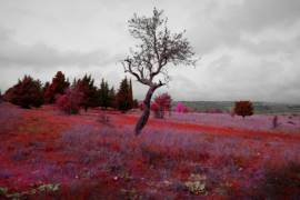 la foto rappresenta un luogo nascosto una montagna vicino ad un lago artificiale , qui l uomo ha trattato questo luogo come una discarica ma con un alba da me catturata anche l orrore diventa bellezza , l uso dell infrarosso enfatizza tutto la natura e la rende un sogno