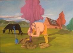 L’opera é una tecnica mista. È un olio e acrilico su tela. È un quadro sulla malasanità, quindi è attuale. C’e un metalmeccanico che si improvvisa infermiere per assistere un paziente che si cura un unghia incarnita per strada. Avevo letto di un dentista che assisteva i suoi pazienti per strada a Napoli. Il dentista non si era mai laureato e si era incaponito per continuare a svolgere la sua attività anche se non poteva avere un ambulatorio. La notizia ovviamente mi aveva ispirato!